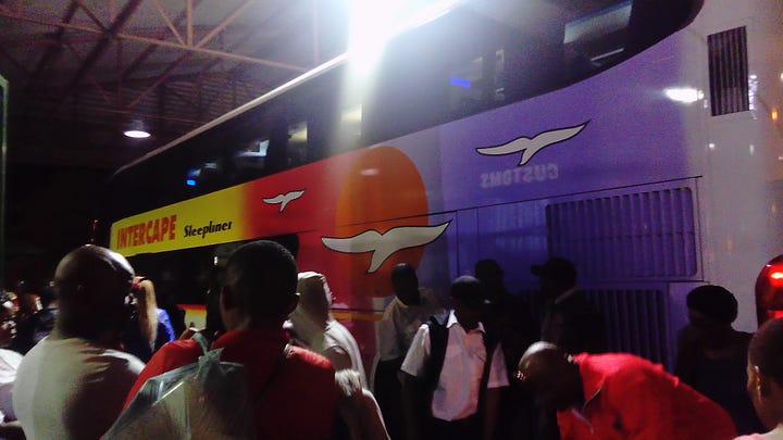 Abaixo, o momento se passa quando embarcava no ônibus em direção à fronteira de Zimbábue.