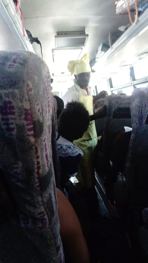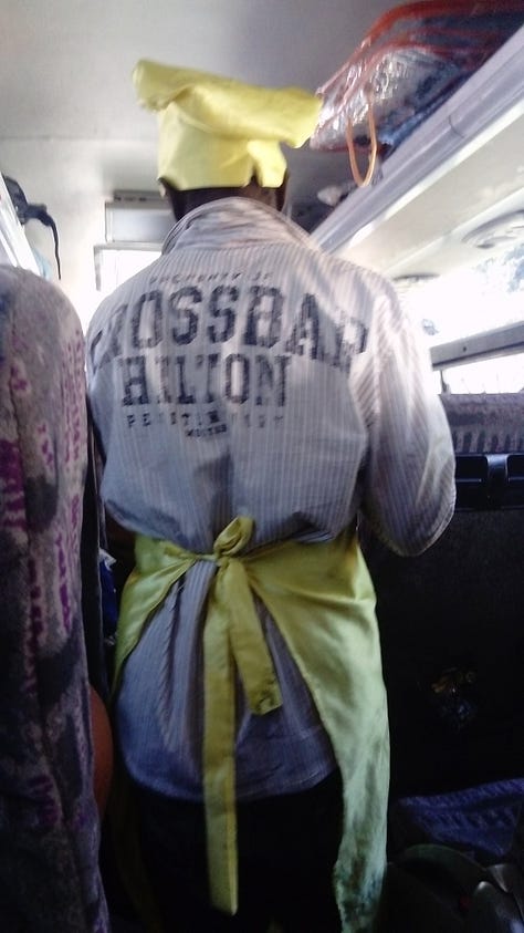 Ou então, na Zâmbia, quando um vendedor trajava um uniforme de cozinheiro completo, incluindo o icônico chapéu de chef. Ele poderia facilmente passar despercebido, mas sua roupa chamava a atenção com o propósito de ver visto. Enquanto ele equilibrava com maestria uma bandeja de sanduíches em um estreito corredor do ônibus, esse desviava das idas e vindas dos passageiros. Aquela comida, porém, eu deixei para outra ocasião — o tempero do sal a gosto escorria de seus poros, sob o calor sufocante de quase 35 graus. Pra que sal quando se tem o toque do chef.
