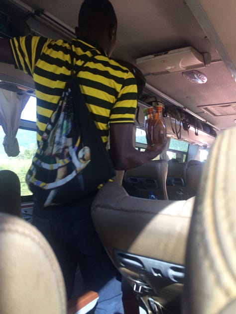 Eu amo viajar de onibus, não pelo fato econômico como muitos pensam. Claro, a depender da distancia, condições da estrada e outros fatores, tudo se torna um fardo. Mas sabendo que aquele trajeto será uma unica vez, me deleito nos personagens que se apresentam. Padres em oficio nesses espaços não faltam no continente africano. Mas também os vendedores. Tenho rasurado sobre estes, desde um vendedor que vendia mel em vidros, onde o selo de qualidade estava: uma abelha dentro como prova de ser mel onde até mesmo o inseto ousou “roubar” e a roupa listrada. Coincidência ou não, a mensagem estava ali, sou o homem abelha vendedor. E assim o vendedor seguia do som "- Olha o mel!!! Ziiiii ( som de abelha) pousando em você. E assim ele ganhava seu cliente. Paguei os 5 do lares pela história.
